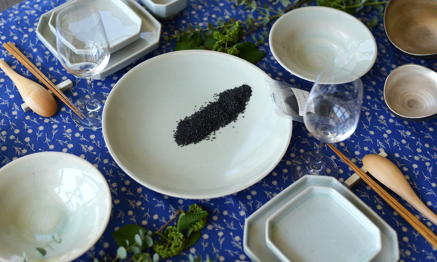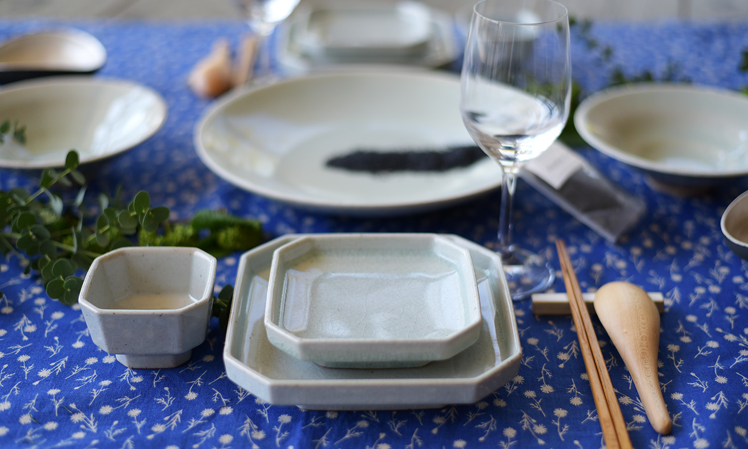 青の生地に小さなマーガレットの花柄がプリントされた爽やかな印象の生地に、ガラスのように透き通った淡い水色が瑞々しい青磁の器を組み合わせ、涼しげな初夏を感じさせるコーディネートに。おおらかな丸皿と伝統的な形で凛とした佇まいのペイヴが何気ない料理も引き立ててくれる。両端に置いたクルヴァーレの銀彩が全体を引き締め、夫婦の大人な食事の時間を演出。