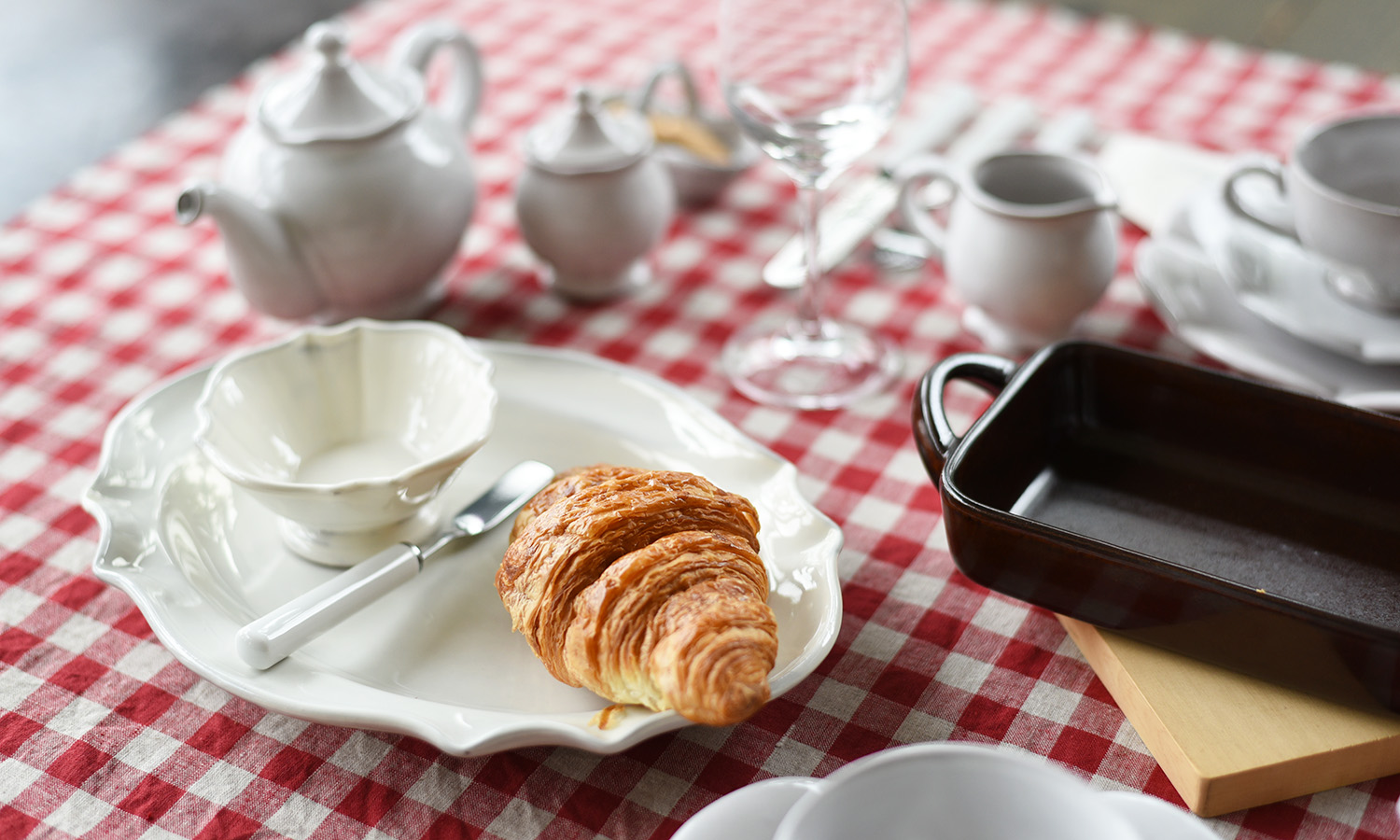 大きめの赤のチェック柄と麻の素朴さがあいまって、可愛くなりすぎないところが人気の生地クルート(赤)。アンティークのような陶器のあたたかさがある白い器で統一感を出しています。女性らしいフォルムのプランドルやフェルメシリーズで素朴さとエレガントさを演出した大人可愛い、女子のランチをイメージ。