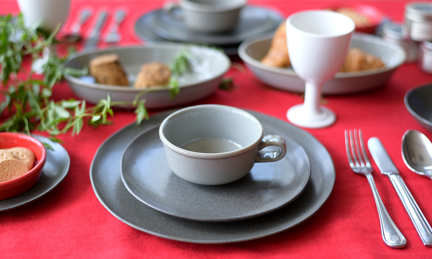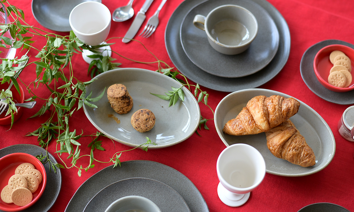 ざっくりとした織りで、鮮やかな赤色の中に柔らかさが感じられるグロッシェ(赤)。オルスやタプナードなど表情のあるグレーの食器を合わせることで、特別感がありながらも落ち着いた雰囲気を演出してくれます。いつもと違った気分でいただく、大人のディナータイムをイメージ。