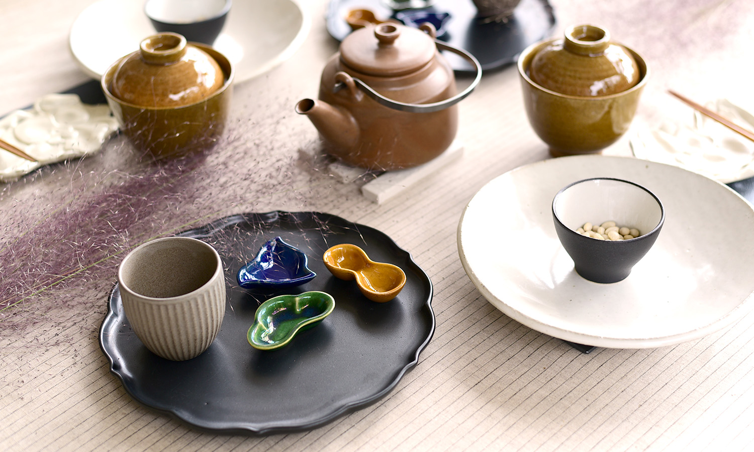 麻の素材感を楽しめるオーソドックスな生地。ブラウン系のやさしく控えめな色合いが温かい食卓を作り出します。プレートを組み合わせて敷き皿として使うことで、家にいながら割烹料理店ような雰囲気に。色と形が可愛らしい豆皿がアクセントになり、夫婦の時間をより楽しいものにしてくれます。