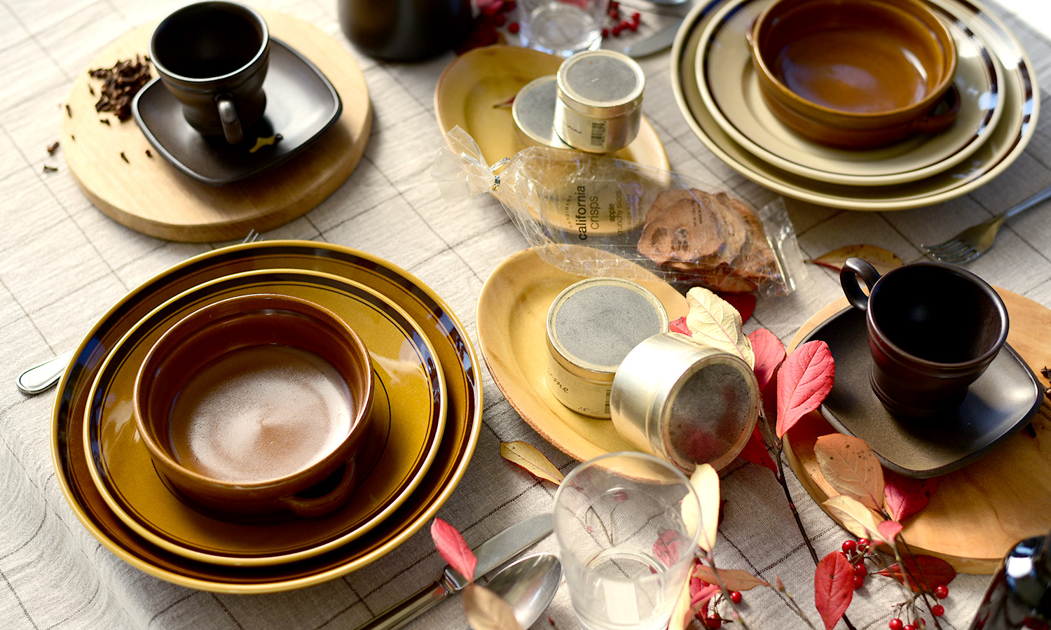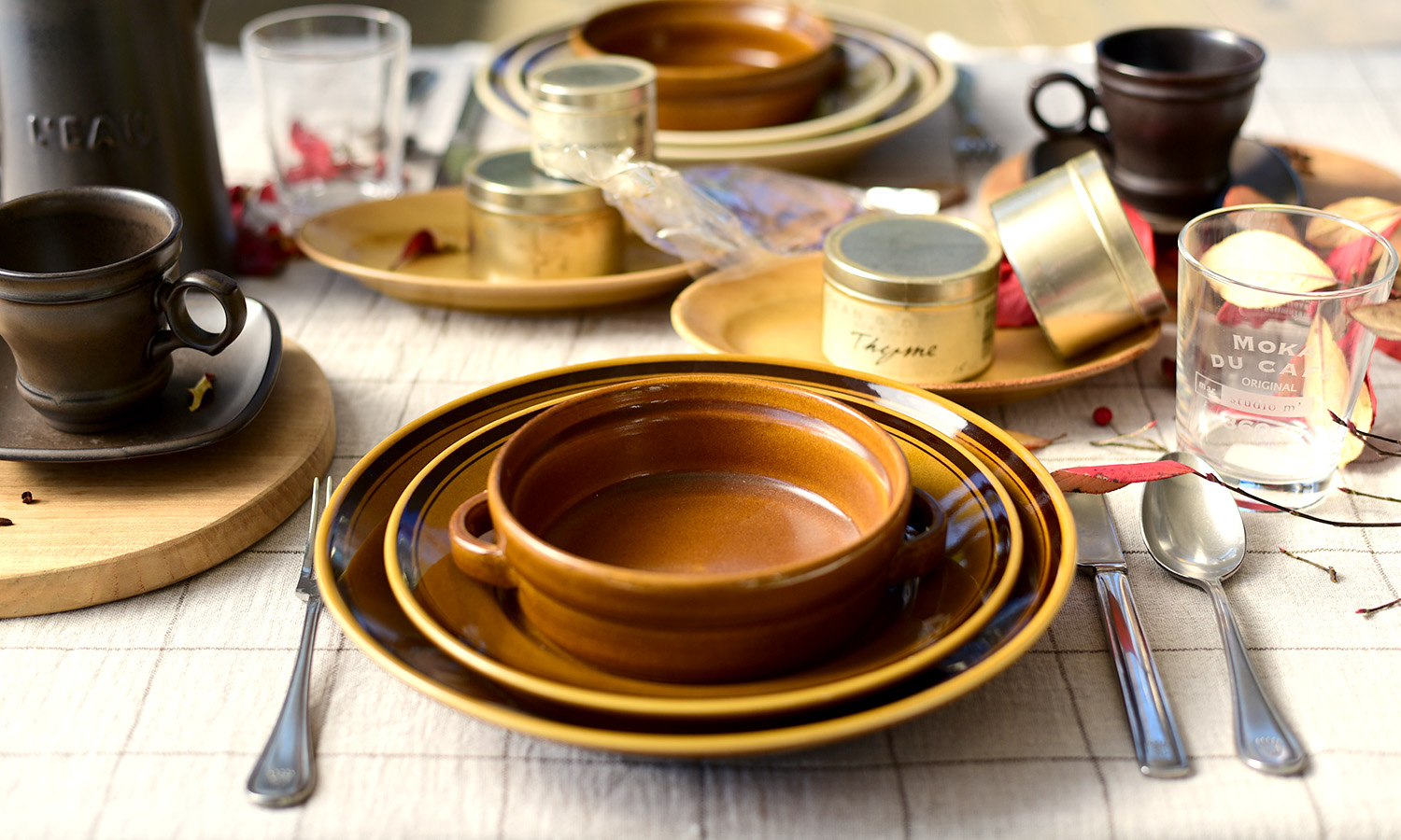 透け感のある生成をベースに、こげ茶のラインが入った落ち着きのある配色のボイルチェックL(茶)。ざっくり織られた薄手の生地からは、麻特有の風合いが感じられます。今回イメージしたのは、飾らない夫婦のランチタイム。器を暖色で揃え、またマットな質感の器を取り入れ、深まる秋を感じられるコーディネートに。