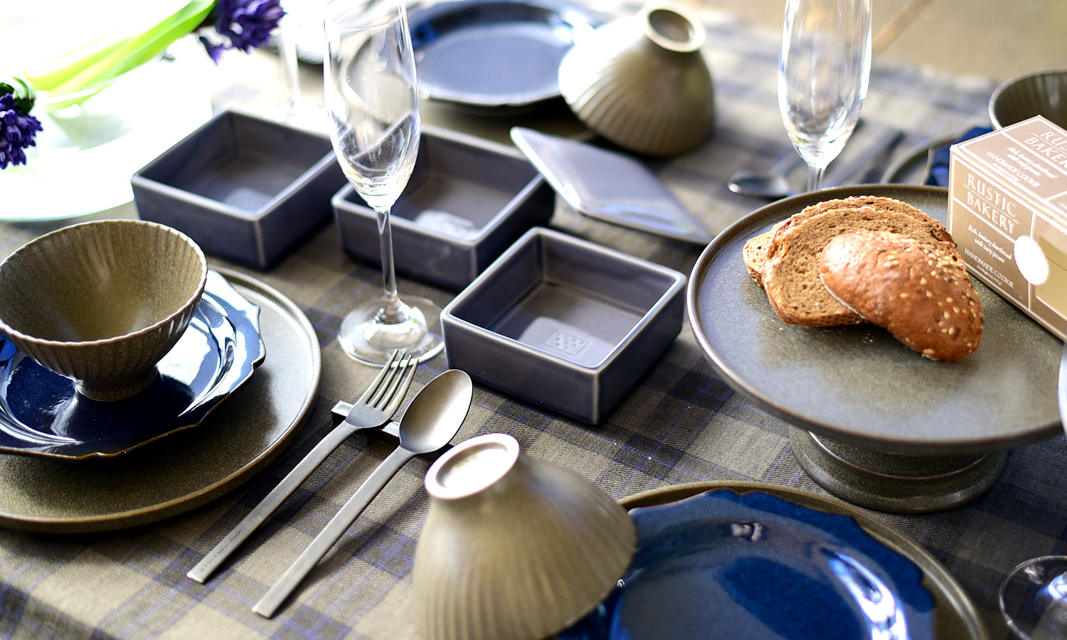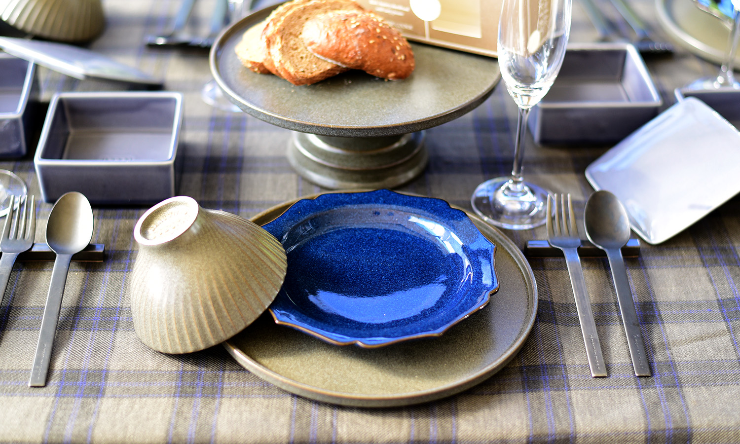 グレーのベースにチャコールグレーのラインとポイントに細いブルーのラインが入ったタータンチェック生地。生地の落ち着いた色味とコーディネートに取り入れた和食器が、冬の食事に季節感をプラスしてくれます。ミッレにはスープを入れ、リセのお重にマリネやサラダを入れて並べると、手軽にいつもと違った雰囲気に。友人を招いておうちでゆっくり楽しむディナーの時間。