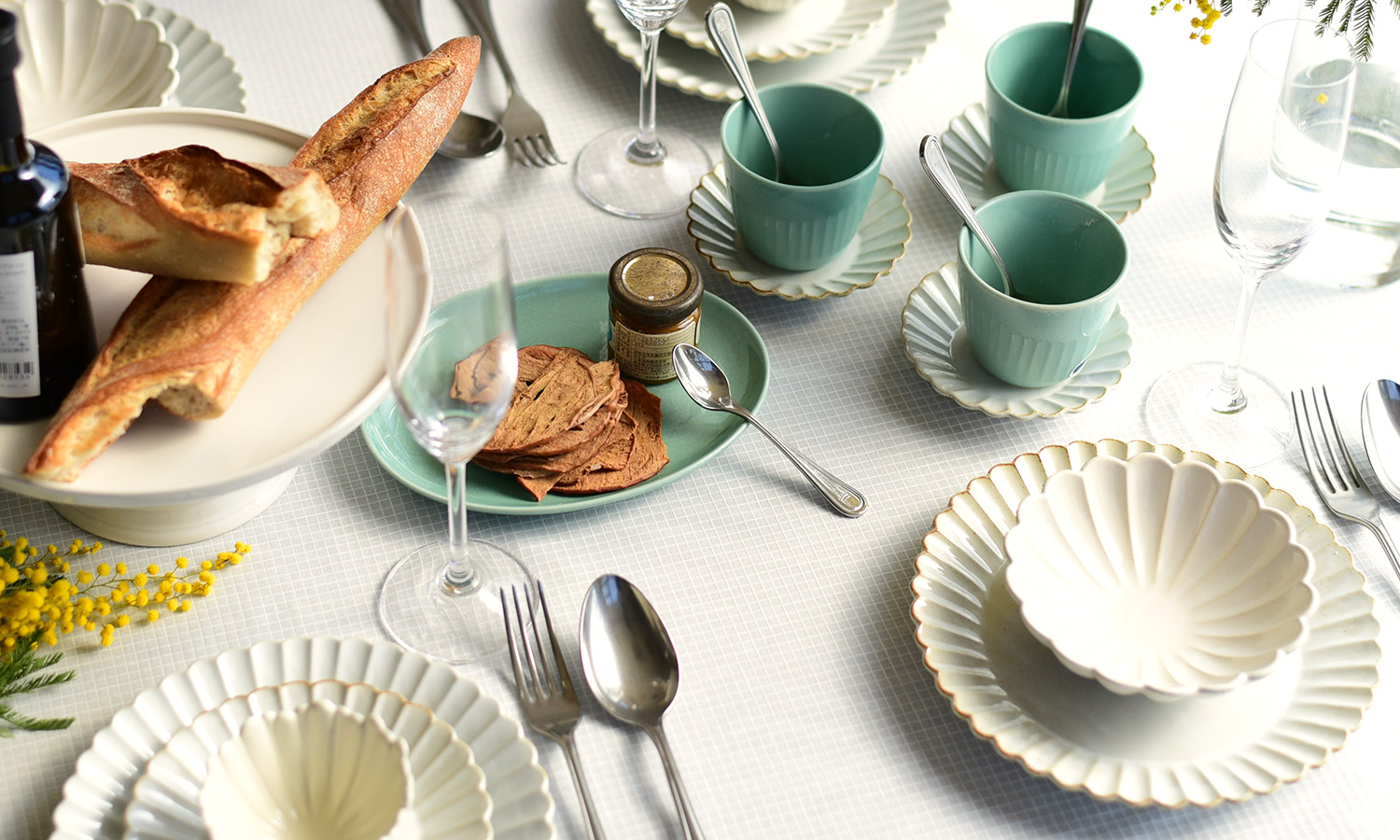 コットン100%の細かなチェックが入った生地。シンプルな生地ながら太い糸で立体的に出したチェック柄は動きがあり、単調な印象になりません。そんなガーゼチェックを使って、ミモザが映える春のコーディネートに。鮮やかな黄色のミモザに、清潔感のあるガーゼチェックの生地とミントグリーンやホワイトなど淡い色味の器を合わせると、爽やかで上品にまとまります。“バルバリ”のプレートと“たんぽぽ”の小鉢を重ねて、花が咲いたようにセッティング。お洒落な友人たちと春の花を楽しむランチパーティーを。