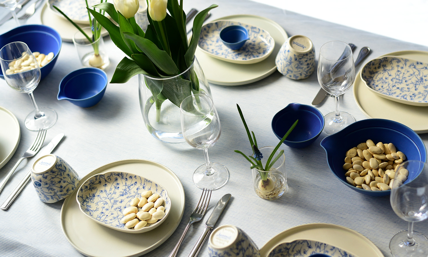 うっすらと入った細かいストライプが爽やかな雰囲気の生地。生地と合わせてブルー系や小花柄の食器を選ぶと、とびきり爽やかで涼やかなコーディネートに。春の明るい日差しの中でいただくブランチ。カジュアルな雰囲気で、ゆったりとした心地良い時間が流れます。