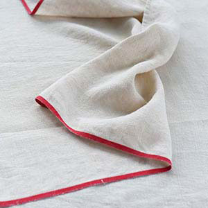 テーブルランナーとして短い幅で作った生地で、両端の赤いラインがアクセント。