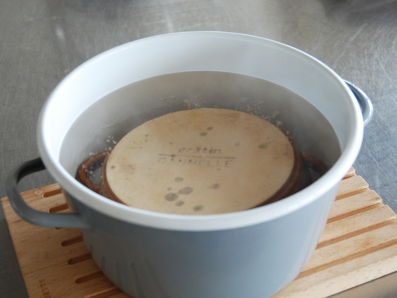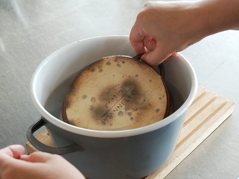 弱火で加熱をしていくと重曹がだんだん溶けてきます。 沸騰したら、器を入れて約1時間放置します。