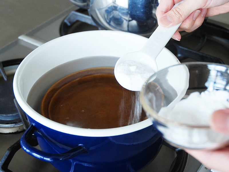 鍋に1.5Lの水を張り、そこに大さじ2杯の重曹を入れます。