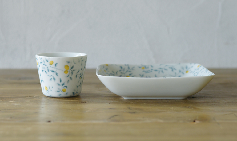 白磁の透明感のある白さとレモン柄が相まって、より夏らしい爽やかなシリーズに仕上がりました。