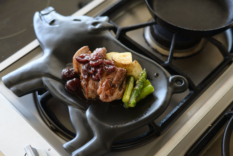 ポークグリラーで調理した肉料理をそのまま食卓に運んで熱々をいただく。