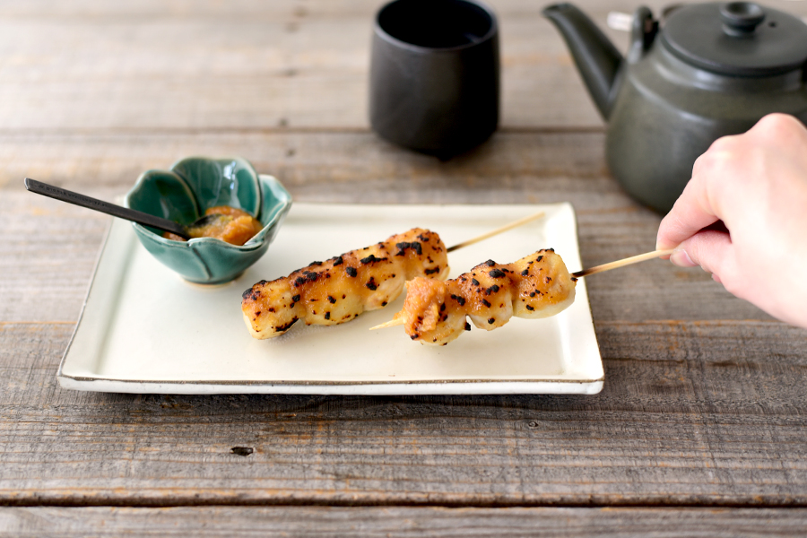 蒸かした里芋を串に刺し、味噌だれを塗って軽く炙ったものです。