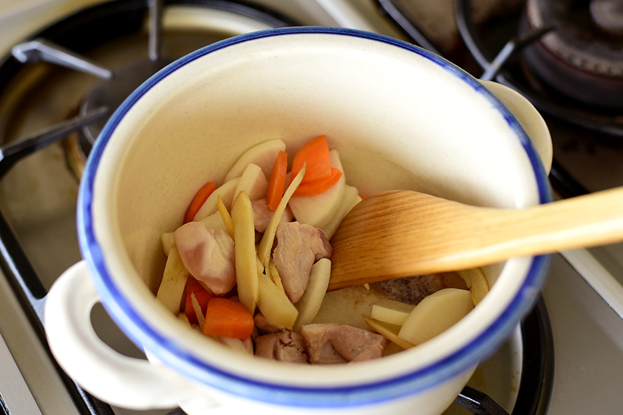 作り方は豚汁と同じですが、豚肉ではなく鶏肉を野菜と一緒に炒めます。