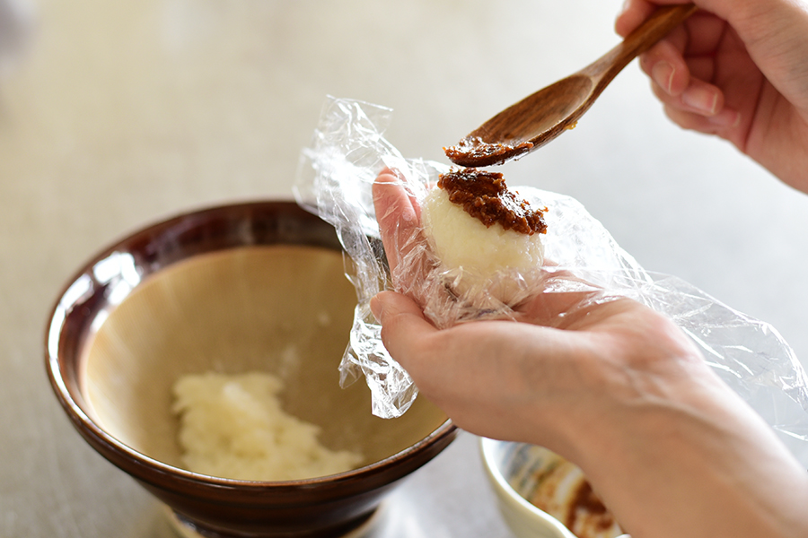 うるち米を丸めたものにじゅうねん味噌を塗って焼いたものが美味しいと