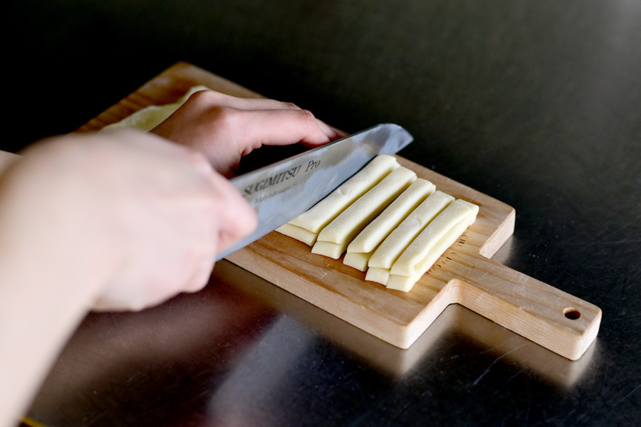 ほうとうの麺は小麦粉を水で練り伸ばして折り重ね、幅広に切って作ります。