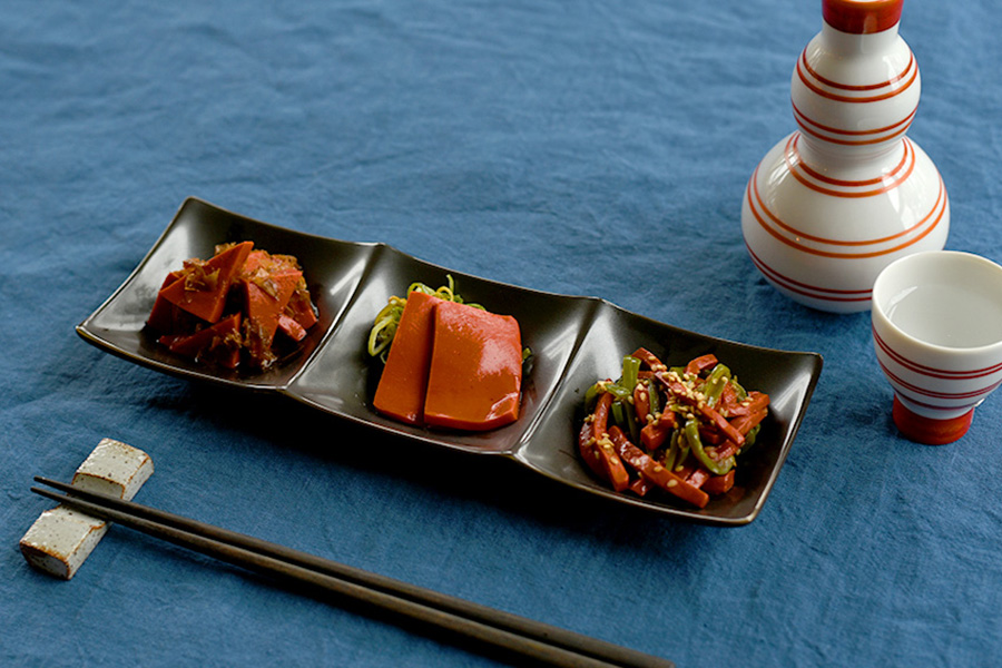 白に盛るとこんにゃくの鮮やかな赤が綺麗に映えます。