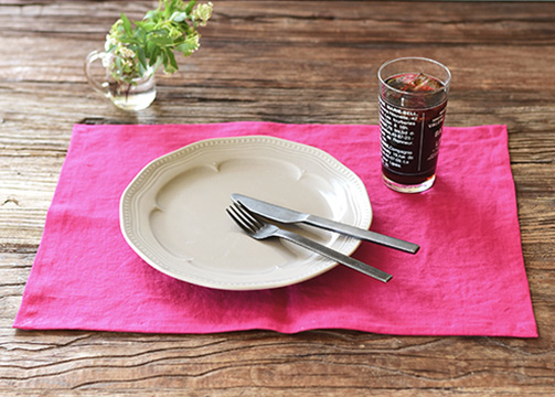 こだわって作られたスタジオ エムのリネン生地のランチョンマット。いつものテーブルに加えるだけで、雰囲気も明るく華やかになる。