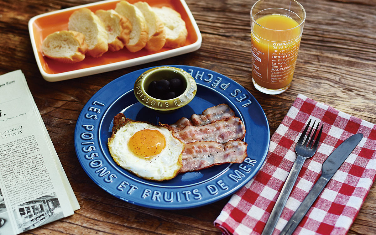 カリッと焼いたベーコンと目玉焼きでアメリカンな朝食