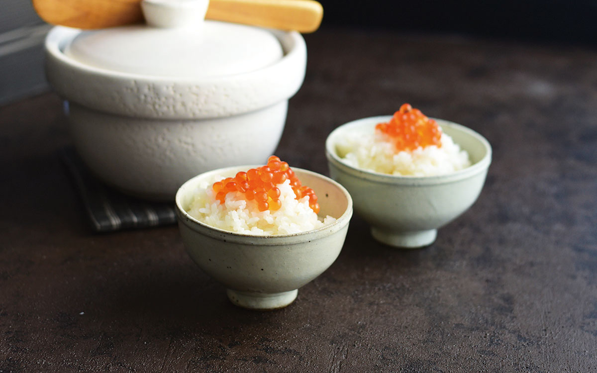 土鍋で炊いたご飯にいくらをのせて、シンプルで贅沢な朝ごはん
