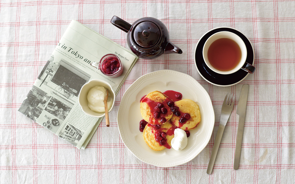 ベリージャムたっぷりのパンケーキと紅茶を、シンプルな器でいただきます。
