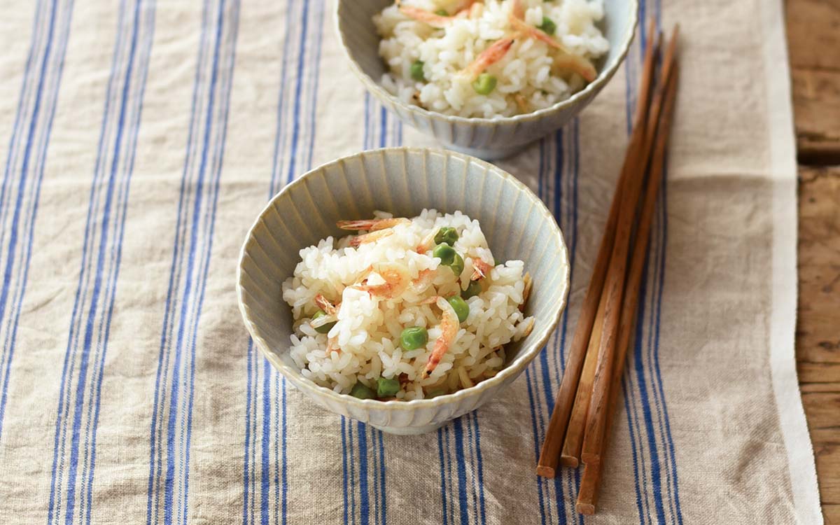 桜えびのピンクとえんどう豆のグリーンが鮮やかな春の混ぜご飯