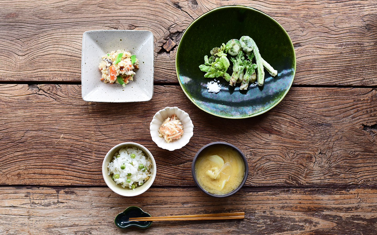 わらびやふきのとうの天ぷら、豆ご飯、ほろ苦い春の味わいの朝ごはん