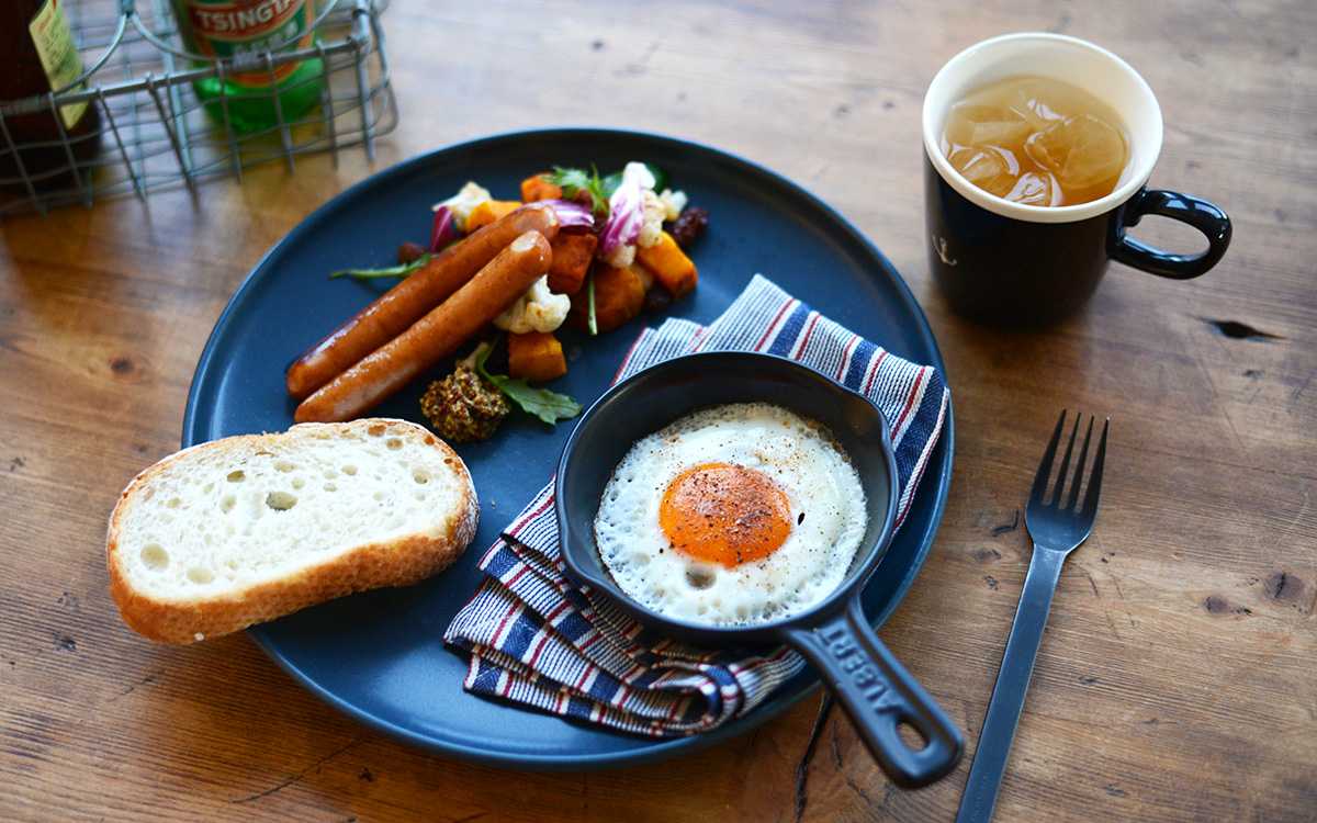 目玉焼きを作ってそのまま熱々をサーブ。無骨なシルエットがかっこいいエッグパンでワンプレートもキマる。