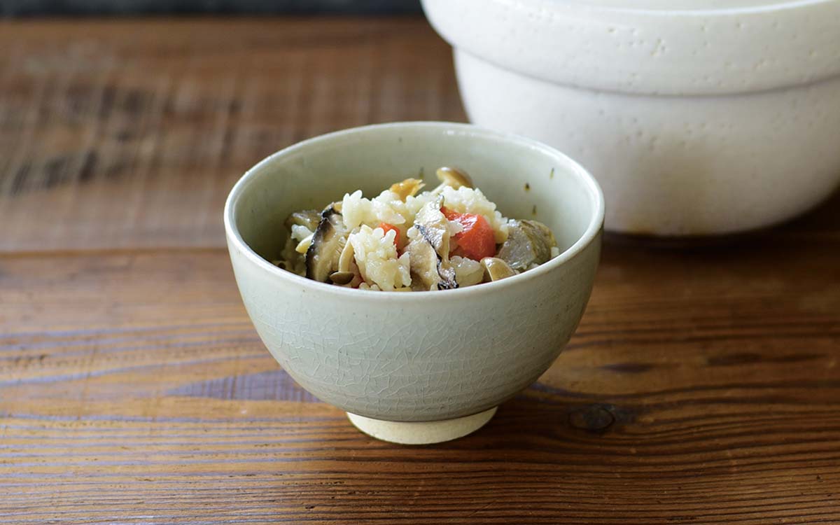 きのこたっぷりの炊き込みごはんは、土鍋で炊き上げておこげまで楽しんで。
