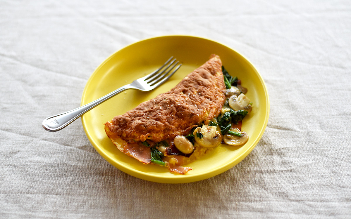たまご色のプレートは具材たっぷりのオムレツにぴったり。