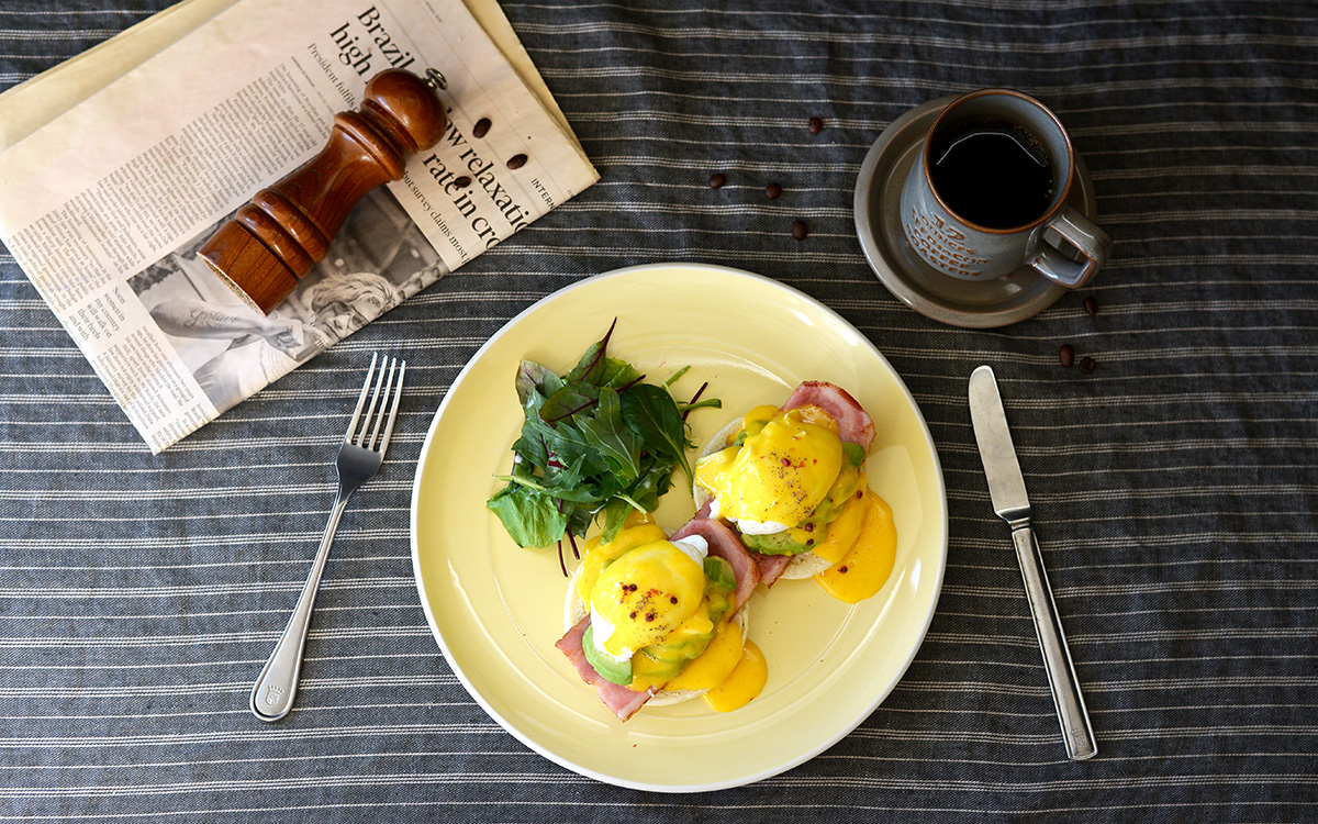 落ち着いた色とラインがかっこいいプレートにヴィンテージの雰囲気のあるマグでお洒落に楽しむエッグベネディクト。