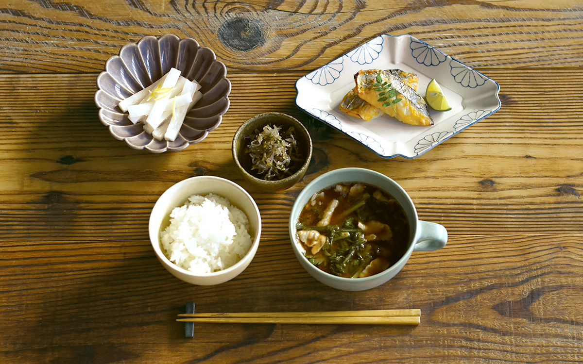 一汁三菜を上品な華やかさのある器に盛りつけて、きちんとした一日のはじまり