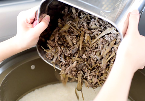 牛しぐれ煮を一緒に炊き込みます。