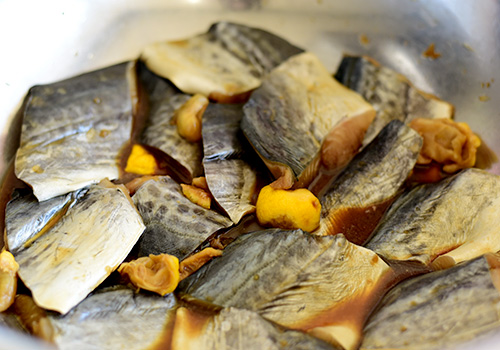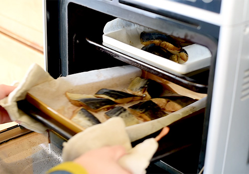 鯖は柚たっぷりのタレにつけおいて、オーブンで焼きます。