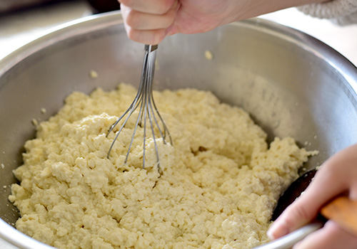 しっかり水切りをした豆腐を泡立て器で滑らかに潰しています。