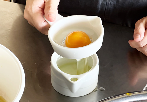エッグセパレーターで卵黄と卵白を分けていきます。