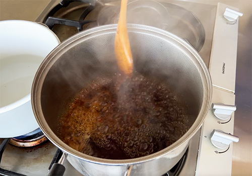 カラメルの焦がし具合に悪戦苦闘。直営店の食堂ペコリではかなり攻めた苦味のあるカラメルなので(詳しくは「マルミツポテリの直営店に行こう!!」にて)それを目指しましたが、焦げるのが怖くて早めにあげてしまいましたとさ。