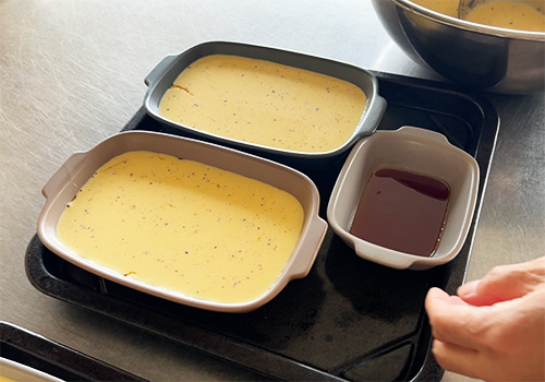 今回は、卵黄を多めにしたリッチなプリン。バニラビーンズもたっぷり使います。