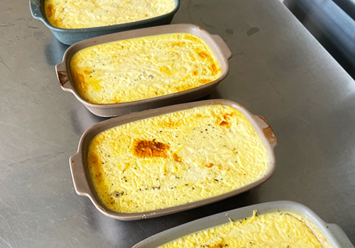 プリンの型に使ったのは、2022秋冬の新作キュイオフール。オーブン・直火okなので、活躍の幅が広がります。さりげなく付いた取手は、持ち運びに便利かつ並べる時邪魔になりにくいサイズ感。底の緩やかなカーブは料理をすくいやすく、洗いやすいのも良いところだなと、実際に使ってみて実感しました。