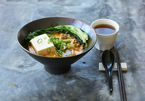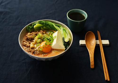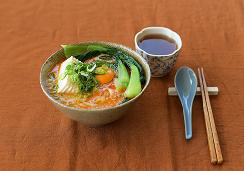 陶器のレンゲや木の箸など異素材の食器を取り入れながらも、まとまりあるテーブルに仕上げました。