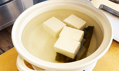 今度は昆布と豆腐をことこと火にかけて土鍋で湯豆腐作りです。