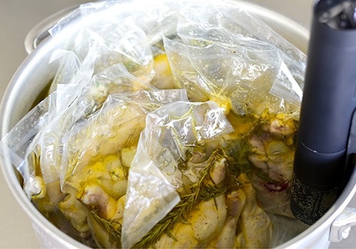 にんにくとハーブ、オリーブオイルを入れて真空にした鶏肉を、ひたすら煮ます。