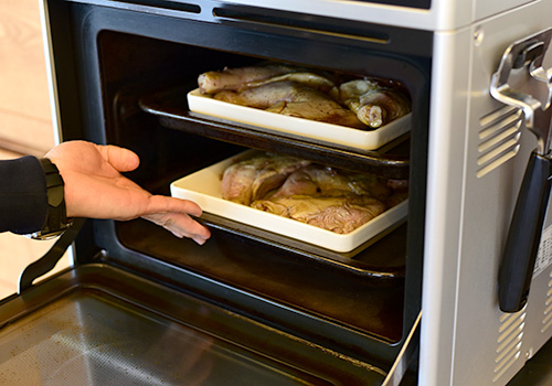 鶏肉を煮終わったら、あとはオーブンで表面に焼き目をつけるだけ。