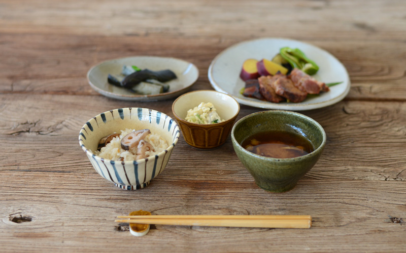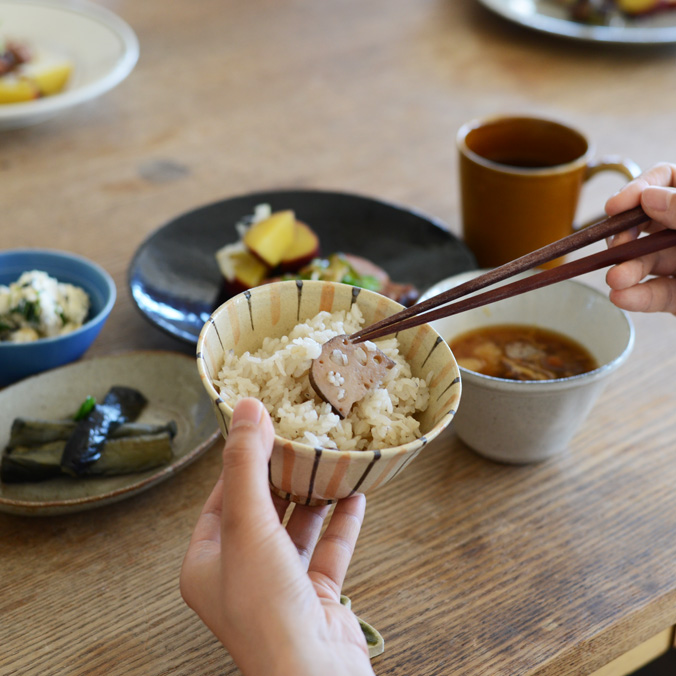 柄の器やオーバル形のもので変化を付けています。(飯碗)麦藁手飯碗 大平
