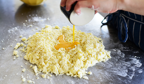 チーズ、強力粉、卵を加えて混ぜていきます。