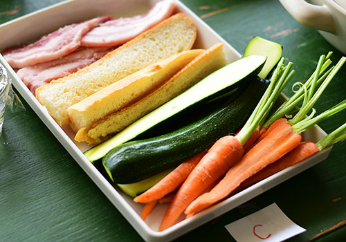今回は「人参」「ズッキーニ」「塩豚」「バゲット」を調理していきます。