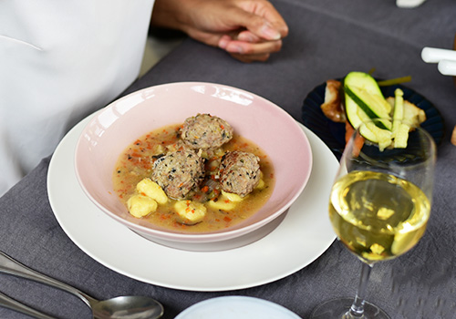 グリル野菜と盛り付け終わったニョッキ、そして社長の作った焼きトマトのスープを運び、