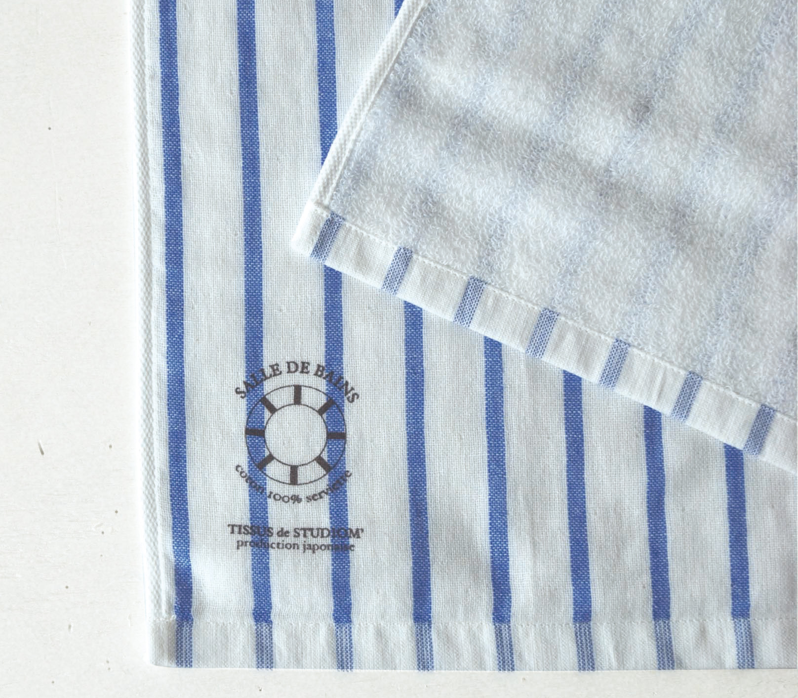 爽やかなブルーのラインが入ったタオルで、浮き輪をモチーフにしたロゴが隅に入っています。