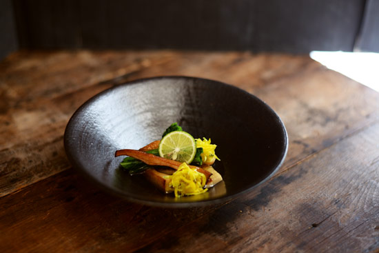 渋めのお皿にお料理が美味しそうに盛り付けられていました。