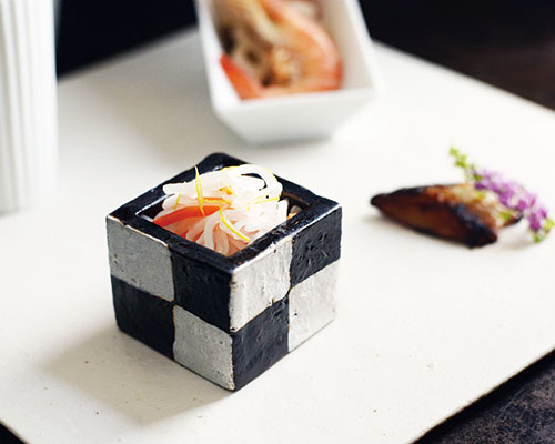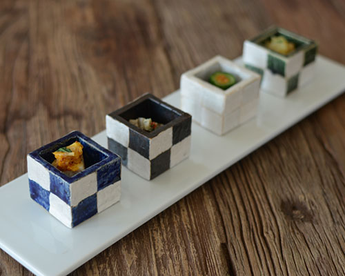 市松模様と銀彩が目を引く「銀彩市松 角小付」。