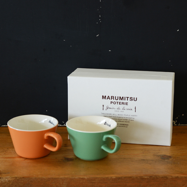 *左から、レギュームマグ(グリーン)、トーストマグ(ココア)、ナショナルカラーマグ(イタリアンレッド)