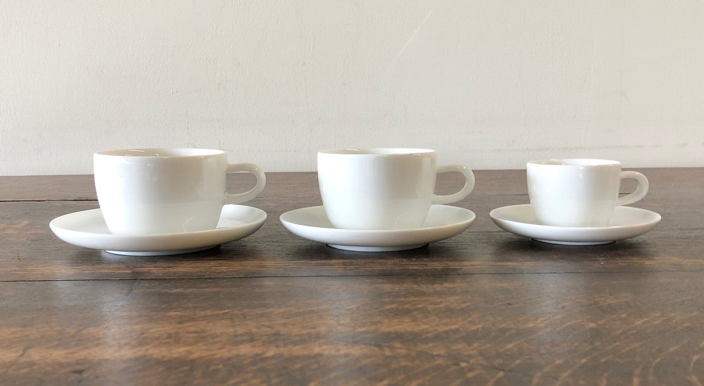 サイズは左からクレムカップ(225cc)、カプチーノカップ(190cc)、エスプレッソカップ(90cc)の3サイズ。(容量は満水時)