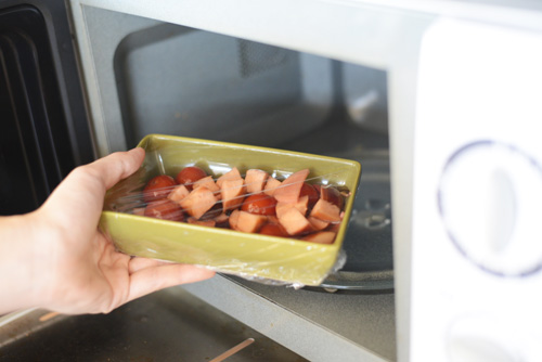 ラップを掛けて持っていくだけなので、そのままレンジにかけられるし、洗いものも少なく済んでとっても便利!